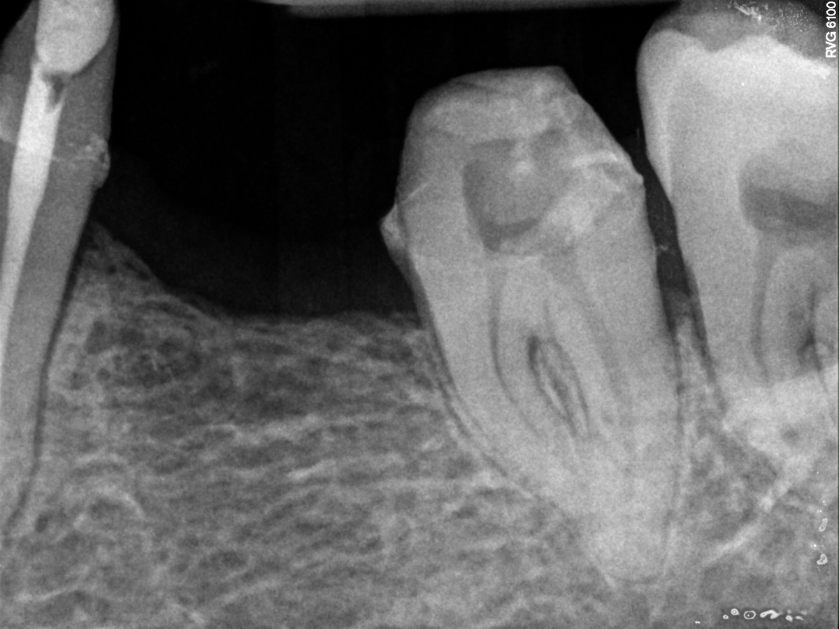 Il granuloma normalmente è ben visibile con piccole radiografie endorali (link) in cui si vedrà un’area più scura di rarefazione ossea intorno all’apice di una o più radici. Con il tempo, e senza trattamento, il suo volume si estenderà fino a rompere la corticale ossea più esterna e questo comporterà la formazione di un’ascesso. L’andamento cronico e silenzioso della lesione può essere quindi interrotto da improvvisi e dolorosi episodi ascessuali.